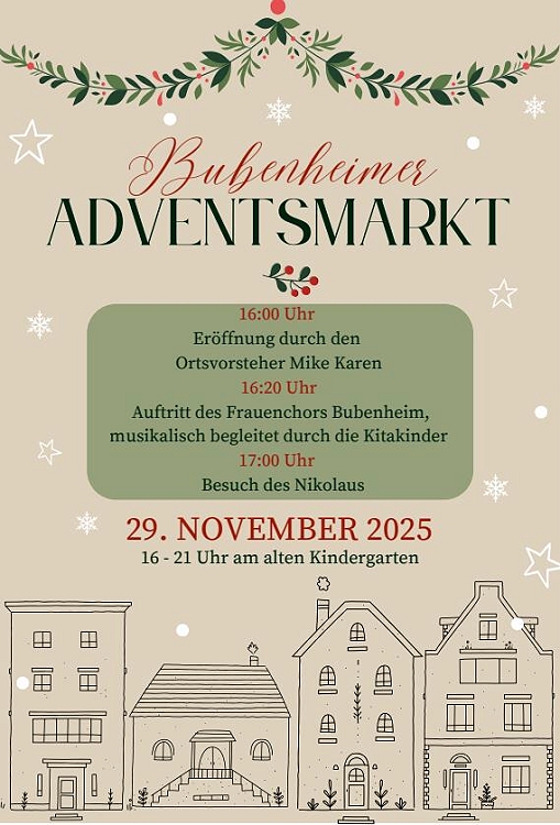 1052 wurde Bubenheim zum ersten Mal urkundlich erwähnt. Der Name „Buobenheim“ –„Heim des Bubo“ geht vermutlich auf fränkischen Ursprung zurück. Es war der Name eines fränkischen Grundbesitzers, der einer der ersten gewesen sein dürfte, denn fränkische Ortsnamen mit der Endung ‚heim’ bezeichnen den „ersten“ Einwohner (sog. Insassenname). Ebenfalls 1052 ließ sich die adlige Witwe Glismuot zur Vergebung ihrer Sünden in Bubenheim eine Kapelle bauen (Alte Kirchstraße), die zunächst dem Apostel Andreas, später dem hl. Maternus geweiht war. Heute noch erinnert die Glismuotstraße an die Stifterin.